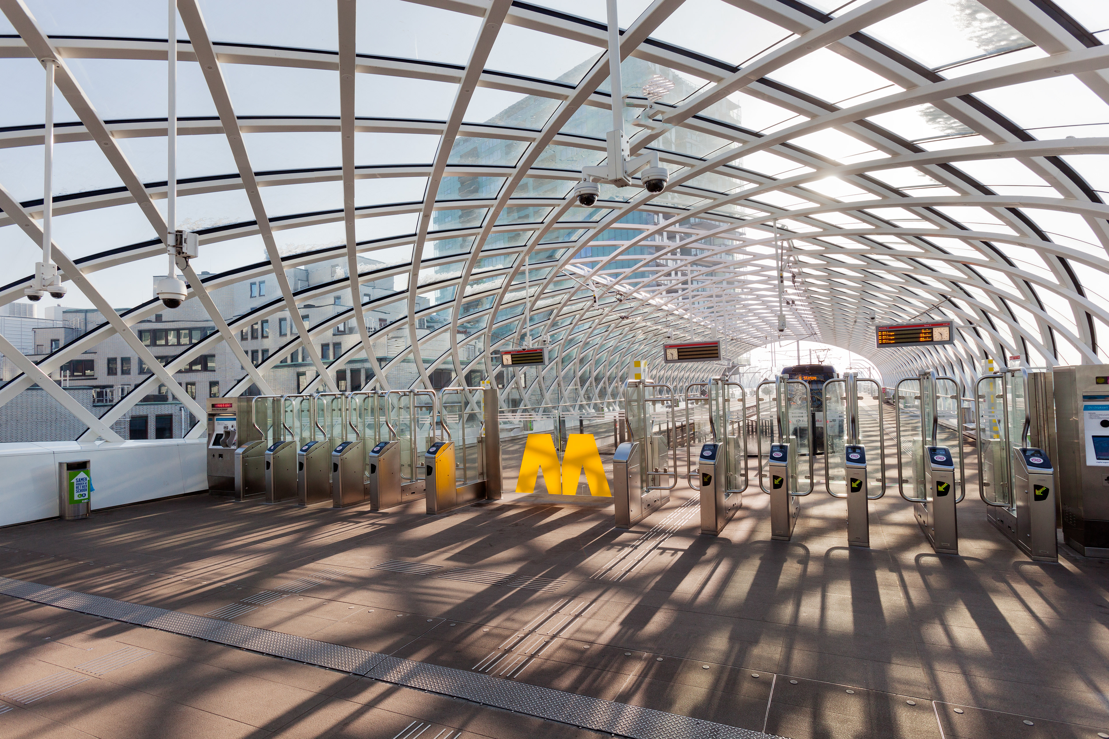 Train waiting for red light at the Hague Central Station in the Netherlands