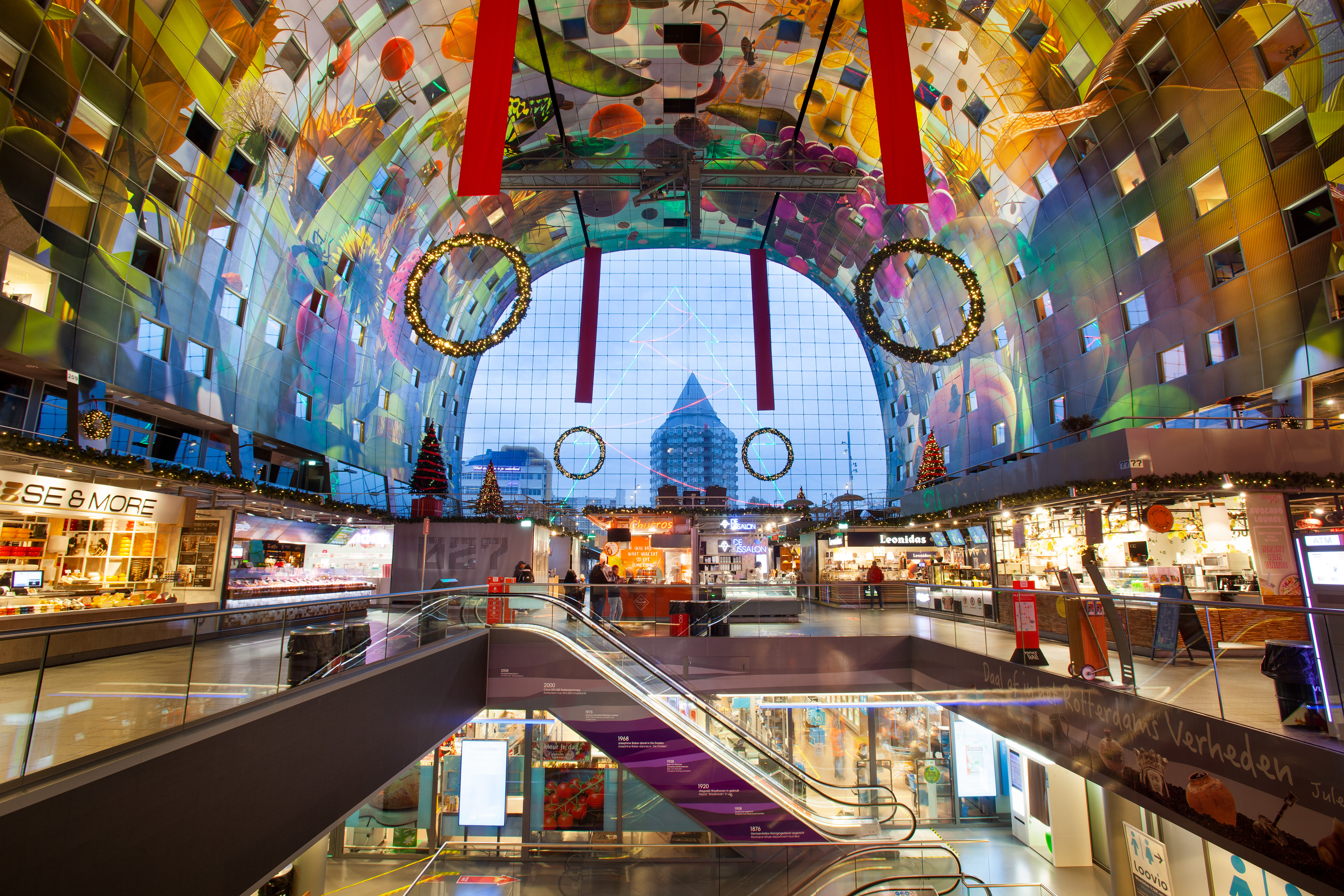 Exterior at twilight of the famous markthal or market hall in Rotterdam